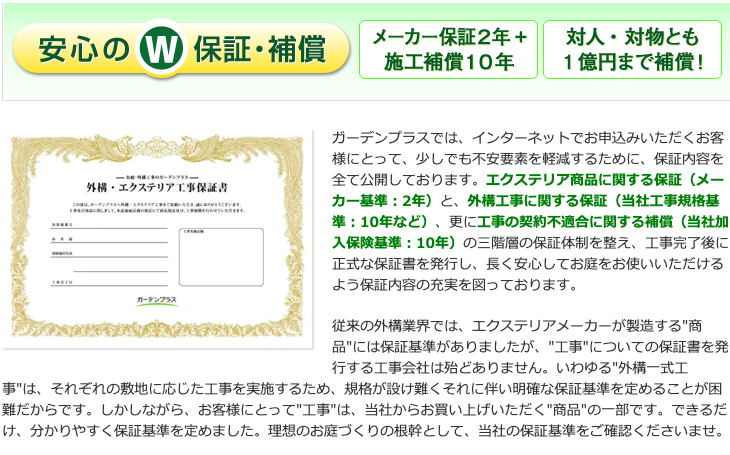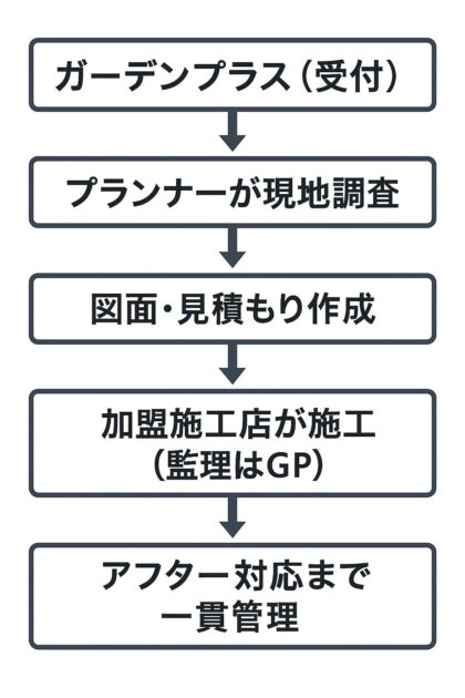 ガーデンプラスは現地調査→図面提案→施工→保証までワンストップ。3Dパース提案や長期保証が強みです。(商品2年+施工10年+契約不適合10年)