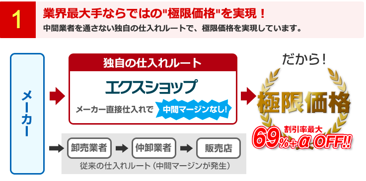 ネット販売に特化し、実店舗を持たない分、運営コストを削減しています。そのため、有名メーカー商品でも割引率が高く設定されています。