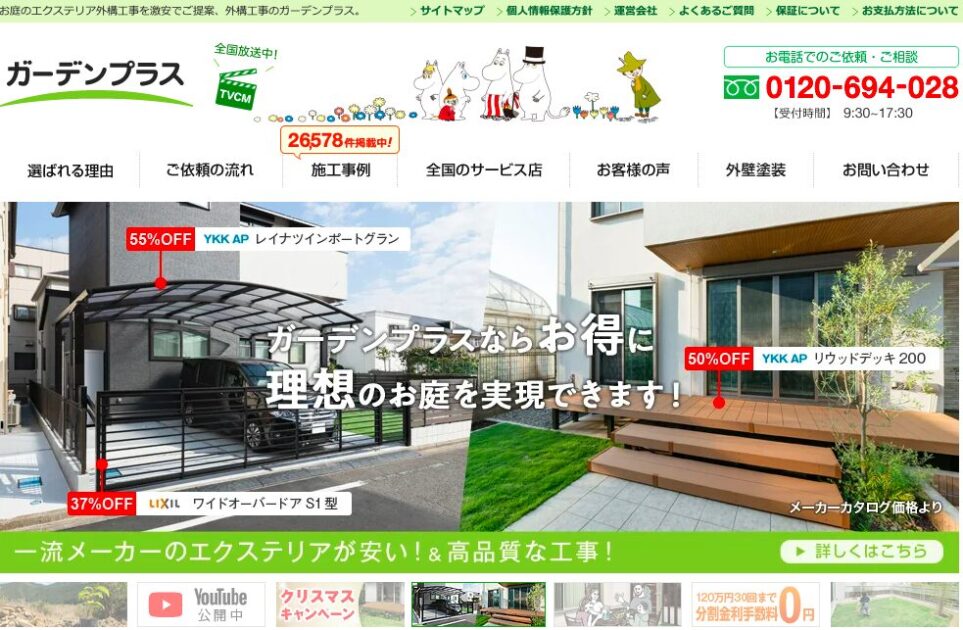 ▶︎創業から20年以上運営、累計4万件以上の施工実績があり、プロサッカークラブ「ヴィッセル神戸」のオフィシャルスポンサーでもある。プロのデザイナーが多数在籍するデザインセンターを保有しており、全国にある支店でヒアリングした情報を元に、デザインセンターで外構プランを3Dパースで作成。36回まで分割金利手数料0円。私の新築外構工事で16社見積もりした中で最安値を提示してくれたのがガーデンプラスで、対応やデザインも良かったので一番おすすめ。 - タウンライフリフォーム・・利用者数54万人、加盟業者数670社 対応エリア:全国 利用は無料。