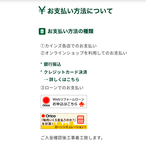 カインズホームでは、クレジットカード・振込・リフォームローン(オリコ)の3種類が利用可能。