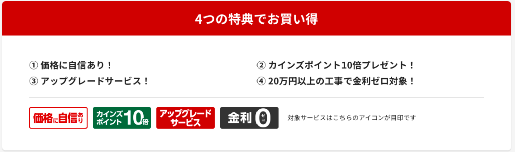 時期によっては「カインズポイント10倍」や「20万円以上の工事で金利ゼロ対象」の特典あり。