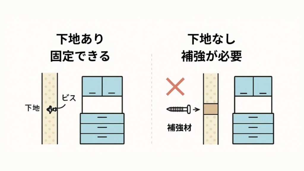 - 「壁が石膏ボードだけで、重い収納をしっかり固定できなかった」