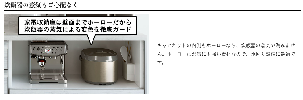 スライド式のキャビネットに炊飯器を置いても、蒸気で天板が劣化しにくい工夫が施されています。
