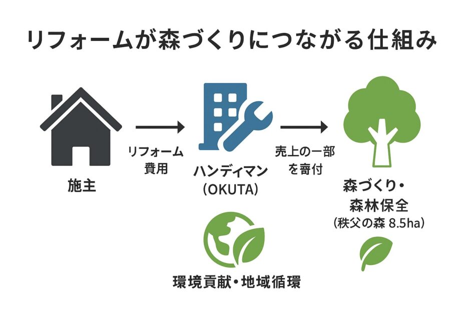 ハンディマンは「OKUTAの森」プロジェクトを通じて、リフォームの売り上げの一部を森林保全に回しています。