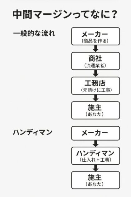 ハンディマンは「中間マージン(仲介手数料)」を減らす仕組みで、同じ工事内容でも総額が下がりやすいです。