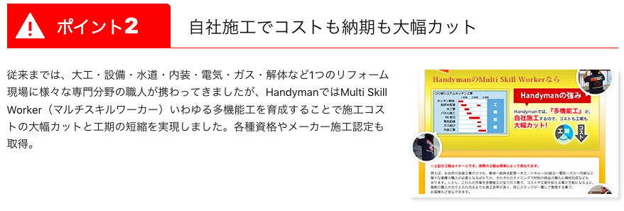 ハンディマン | 自社で仕入れ+施工 | マージンが少なく費用を抑えやすい |