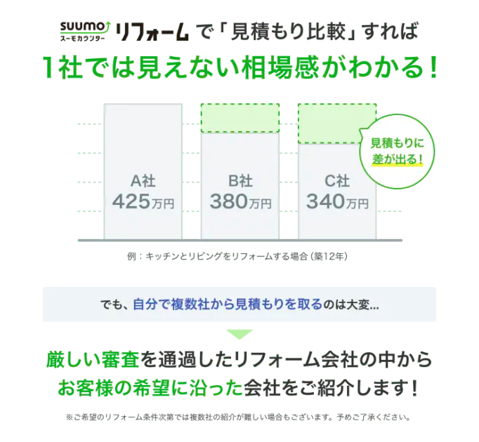 SUUMOリフォームは審査を通過した会社のみ紹介しており、複数社に同時見積もりを依頼できるため、自然に価格競争が生まれます。